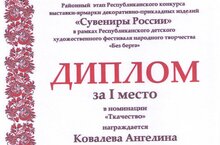 Поздравляем юных мастериц из студии "Завиток" (педагог Елена Евгеньевна Егорова) с победой в районном этапе республиканского конкурса выставки-ярмарки декоративно-прикладных изделий "Сувениры России", который прошел в рамках Республиканского детского художественного фестиваля народного творчества "Без бергә"! В номинации "Ткачество" I место заняла Ковалева Ангелина, а Давидова Зилия и Касимова Милана разделили между собой II место! Молодцы! Отличный результат! Если хотите добиться такого же, приходите сами и приводите детей в Центр детского творчества и Елена Евгеньевна научит вас изготавливать картины и панно в технике "ткачество"!