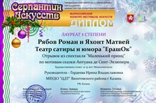 Под руководством Гордеевой Ирины Владиславовны учащиеся театра эстрады, сатиры и юмора "ЕрашОК" Рябов Роман и Яхонт Матвей стали лауреатами I степени Всероссийского конкурса-фестиваля искусств "Серпантин искусств". Поздравляем!