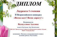 Учащиеся объединений декоративно-прикладного отдела получили целую россыпь наград на II Всероссийском конкурсе "Весна идет! Весне дорогу!" в следующих номинациях: "Рисунок в нетрадиционной технике", "Время года Весна", "Авторская фотография", "Изобразительное искусство", "Видеоролик". Победителями стали: Валиуллины Аделина и Эвелина, Тюрикова Арина и Володягина Аделина - учащиеся студии "Радуга творчества" под руководством Быстровой Л.М.; Гилязов Айнур, Зайнуллина Зарина, Исхакова Амелия, Нагимова Камила - учащиеся студии "Палитра" под руководством Антиповой И.С.; Даминова Азалия, Камалова Капитолина, Мочалова Аделина, Салова Анастасия, Сугаюнова Амина, Сунгатуллина Эльза и Хаертдинова Язиля - учащиеся студии "Озорные краски" под руководством Гиздатуллиной К.М. Великолепный результат! Поздравляем! Так держать!