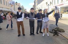 В Центре детского творчества продолжается акция "10 дней до Победы". 8 мая, в рамках акции учащиеся театра-студии "Ровесник" (руководители Мария Юрьевна Андреева и Лариса Николаевна Борисова) и представители детских общественных организаций, входящих в Ассоциацию "Вахитовец" (руководитель Людмила Михайловна Фоменко) вручали символ Праздника Победы - георгиевскую ленту жителям города Казани.