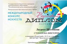 Поздравляем учащуюся вокальной студии "Шатлык" Степанову Викторию и ее руководителя Миляушу Рифатовну Альмееву с получением звания лауреата III степени международного конкурса искусств "Вдохновение"!
