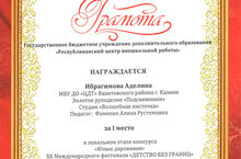 Поздравляем с Победой в зональном этапе конкурса «Юные дарования» XX Международного фестиваля «ДЕТСТВО БЕЗ ГРАНИЦ» учащуюся Ибрагимову Аделину студии «Волшебная кисточка» (педагог Фоменко А.Р.), занявшую I место в номинации «Золотое рукоделие». Желаем дальнейших творческих успехов!