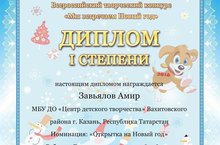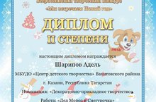 Поздравляем Шарипова Аделя, обучающегося объединения «Рукоделие» (педагог Шигапова Г.Р.), с победой в Всероссийском творческом конкурсе «Мы встречаем Новый год» - Диплом II степени.