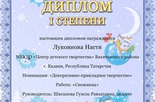 Поздравляем Лукоянову Настю, обучающуюся объединения «Рукоделие» (педагог Шигапова Г.Р.), с победой в Международном творческом конкурсе «Фестиваль снежинок» - диплом I степени.