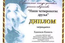 Поздравляем Хакимова Камиля, учащегося объединения «ИЗО» (педагог Бердникова М.Г.), с победой в Региональном конкурсе-фестивале детского творчества «Наши четвероногие друзья» - 2 место в номинации «Творческий подход».