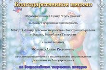 Поздравляем Центр детского творчества Вахитовского района и педагога дополнительного образования Фоменко Алину Рустемовну (студия «Волшебная кисточка»), получивших благодарственное письмо за отличную подготовку и педагогическое сопровождение участников на базе ЦДТ во Всероссийском творческом конкурсе «Наша ёлочка - красавица»