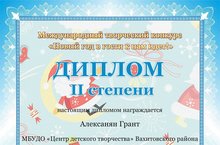 Поздравляем Алексанян Гранта с дипломом II степени (педагог Шигапова Г.Р.) в Международном творческом конкурсе "Новый год в гости к нам идет!"