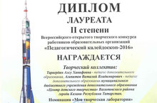 Поздравляем педагогов дополнительного образования Тарвердян Алсу Ханифовну и Агапитова Виталия Владимировича с дипломом лауреата II степени в Всероссийском открытом творческом конкурсе работников образовательных организаций «Педагогический калейдоскоп-2016» в номинации «Моя творческая лаборатория»
