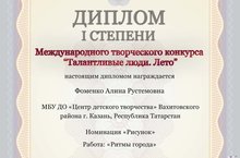 Поздравляем педагога студии «Волшебная кисточка» Фоменко Алину Рустемовну, занявшую I место в Международном творческом конкурсе «Талантливые люди. Лето » в номинации « Рисунок» - «Ритмы города»!