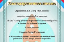 Поздравляем педагога дополнительного образования Фоменко А.Р. с получением благодарственного письма ОЦ "Путь знаний" за отличную подготовку и педагогическое сопровождение участников Всероссийского творческого конкурса "День космонавтики", посвященного 55-летию первого полета человека в космос.