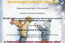 Поздравляем Центр детского творчества Вахитовского района и педагога дополнительного образования Фоменко А.Р., получивших благодарственное письмо за отличную подготовку и педагогическое сопровождение участников на базе ЦДТ во Всероссийском творческом конкурсе "Зимние забавы".