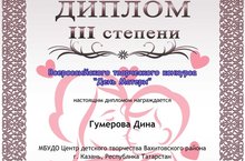 Поздравляем Гумерову Дину, обучающуюся объединения "Рукоделие" (педагог Абросимова Е.В.) с победой - Диплом III степени - во Всероссийском творческом конкурсе "День Матери", номинация "История "Моя мама".