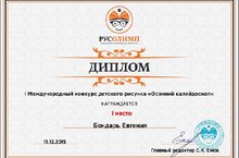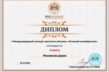 Поздравляем Мясникову Дарину, обучающуюся объединения "Изобразительное творчество" (педагог Федорова Т.Н.), занявшую 2 место в Международном конкурсе "Осенний калейдоскоп".