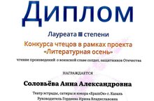 Поздравляем Анну Соловьеву - призёра Всероссийского конкурса чтецов в рамках проекта "Литературная осень"! Благодарим руководителя театра эстрады, сатиры и юмора "ЕрашОк" Ирину Владиславовну Гордееву за отличную подготовку юных артистов!
