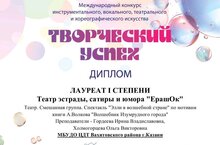 Поздравляем коллектив театра эстрады, сатиры и юмора "ЕрашОК" (педагоги: Ирина Владиславовна Гордеева и Ольга Викторовна Холмогорцева) с получением диплома лауреата I степени международного конкурса инструментального, вокального, театрального и хореографического искусства "Творческий успех"!