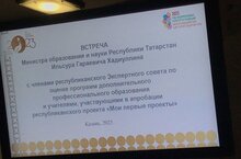 Директор Центра детского творчества Резеда Рифгатовна Саляхова приняла участие во встрече министра образования и науки Республики Татарстан Ильсура Гараевича Хадиуллина с членами Экспертного совета по оценке программ дополнительного профессионального образования и учителями, участвующими в апробации республиканского проекта "Мои первые проекты".