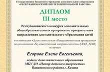 Педагог дополнительного образования Елена Евгеньевна Егорова и методист Оксана Анатольевна Камалова заняли III место в номинации "Дополнительная общеразвивающая программа" (подноминация "Художественная направленность" (ИЗО, ДПИ) республиканского конкурса дополнительных общеобразовательных программ по приоритетным направлениям дополнительного образования детей, организованного Республиканским центром внешкольной работы Министерства образования и науки Республики Татарстан. Поздравляем!