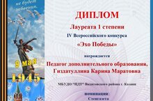 Подведены итоги IV всероссийского конкурса "Эхо Победы", в котором принимали участие учащиеся объединений декоративно-прикладного отдела Центра детского творчества. Ребята очень постарались и заняли призовые места в номинациях: "Изобразительное искусство", "Открытка ветерану", "Пластилинография", "Аппликация", "Плакат". От всей души поздравлям Володягина Дмитрия, Володягину Ангелину, Сыроварову Марию, Хайруллина Искандера, Хусаинова Рамиля - учащихся студии "Радуга творчества" (педагог Быстрова Л.М.); Гилазетдинова Раиля, Даминову Азалию, Камалову Капитолину, Гатиятуллину Самиру - учащихся студии "Озорные краски" (педагог Гиздатуллина К.М.); Ибрагимову Елизавету, учащуюся студии "Мастерица" (педагог Ионова Е.В.) и педагога Карину Маратовну Гиздатуллину, которая заняла I место в номинации "Стенгазета"! Отлично! Так держать! Приходите и вы на занятия в наши объединения! Окунитесь в сладостный мир творчества!
