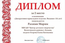 Поздравляем учащихся студии "Завиток" под руководством Егоровой Елены Евгеньевны с победой в районном этапе республиканского конкурса выставки-ярмарки декоративно-прикладных изделий "Сувениры России", проводимого в рамках республиканского детского художественного фестиваля народного творчества "Без бергә": Раимову Ясмину, Ковалеву Ангелину, Хасанову Алию, Рахими Марям с дипломами за 1 место в разных возрастных группах; Рахими Марям - с дипломом за 2 место. Молодцы! Так держать!
