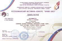 Поздравляем педагогов и учащихся Центра детского творчества, ставших победителями и лауреатами республиканского конкурса "Браво-2023", посвященного Году педагога и наставника. В номинации "Методическая копилка": Елена Евгеньевна Егорова - Гран При, Людмила Михайловна Фоменко - лауреат I степени, Владимир Алексеевич Туктаров и Клария Зинатулловна Васильева – лауреаты I степени, Елена Сергеевна Деваева и Екатерина Леонидовна Петрова – лауреаты II степени, Люция Равилевна Мифтахова и Абдуллина Эльза Альбертовна - лауреаты II степени, Алия Ильдаровна Сафина, Эльвира Маратовна Манюрова, Мария Владимировна Суханова – лауреаты II и III степени, Гузель Равхатовна Шигапова – лауреат III степени, Марина Григорьевна Бердникова – дипломант I степени, Танзиля Наилевна Гарипова и Алия Газизулловна Садыкова – дипломанты I степени. В номинации "Школьные годы чудесные": Танзиля Наилевна Гарипова, вокальная студия «Хыял», театр эстрады, сатиры и юмора «ЕрашОК» - лауреаты I степени.