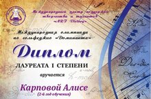 - в номинации «Инструментальное исполнительство – фортепиано. Возрастная категория: 7 – 9 лет», Муфтахова Динара (преподаватель – Перетягина И.Ф.) – Лауреат I степени;