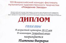 По результатам мероприятия, учащаяся отделения эстрадного (вокального) искусства нашей школы, Платонова Виктория (преподаватель – Валеева Р.С.) стала обладательницей Диплома Гран-При.