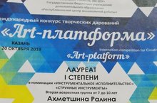 20 октября 2019 года в КДК им.Ленина Авиастроительного района г.Казани состоялся I Международный конкурс творческих дарований «ART-платформа».По результатам конкурса, учащаяся нашей школы Ахметшина Ралина (преподаватель – Волченко Л.П., концертмейстер – Романова И.П.), в номинации «Инструментальное исполнительство», «Струнные инструменты», вторая возрастная группа от 7 до 10 лет» – Лауреат I степени.ПОЗДРАВЛЯЕМ!!!