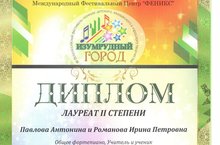 11 мая 2019 года в МБУДО «Детская музыкальная школа г.Зеленодольск Республики Татарстан» состоялся III Всероссийский фестиваль-конкурс детского, юношеского и взрослого творчества «Изумрудный город».По итогам фестиваля-конкурса, учащаяся нашей школы, Павлова Антонина и её преподаватель, Романова Ирина Петровна в номинации «Общее фортепиано. Учитель и ученик» – Лауреаты II степени.ПОЗДРАВЛЯЕМ!!! -