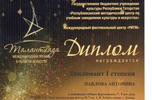 11 мая 2019 года в ДШИ № 15 Ново-Савиновского района г.Казани состоялась Международная премия в области искусств «ТАЛАНТИАДА».Учащаяся нашей школы, Павлова Антонина, в номинации «Общее фортепиано. 7 – 9 лет. Соло» – Дипломант I степени (преподаватель – Романова И.П.).НАШИ ПОЗДРАВЛЕНИЯ!!! -