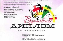 Поздравляем победительницу Всероссийского фестиваля-конкурса детского и юношеского творчества "Вдохновение" Ишмуратову Алину (класс преподавателя Нурмухаметовой Л.И.), с получением диплома лауреата II степени. Желаем творческих успехов!!!