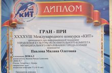 25 ноября 2018 года состоялся XXXXVIII Международный конкурс "КИТ", проходящий при информационной поддержке Управления Культуры ИКМО г.Казани. Призерами конкурса стали: ГРАН-ПРИ - Павлова Милана,преподаватель - Валеева Р.С., в номинации "Вокал", ДИПЛОМ - Павлова Милана, преподаватель - Валеева Р.С., в номинации "За оригинальное прочтение фольклорной темы". ПОЗДРАВЛЯЕМ!!!