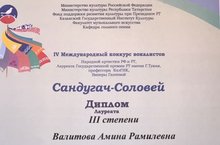 С 1 по 3 марта в КазГИК состоялся IV Международного конкурса вокалистов «Сандугач-Соловей» Народной артистки РФ и РТ, лауреата Государственной премии Г. Тукая, Кавалера 2-х орденов: ордена «Дружбы народов» и ордена «За заслуги перед Республикой Татарстан», солистки ТАГТО и Б им. М. Джалиля, профессора, зав. кафедрой сольного пения КазГИК Ганеевой Винеры Ахатовны. Обучающаяся преподавателя Хасановой Венеры Фархатовны Лауреатом III степени стала Валитова Амина!!! Поздравляем!