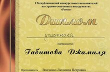 26 февраля в ДМШ №1 им. П.И.Чайковского состоялся I Республиканский конкурс юных исполнителей на струнно-смычковых инструментах "Presto". В конкурсе приняла участие обучающаяся класса преподавателя Волченко Людмилы Петровны - Габитова Джамиля.