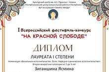 29 сентября 2024 года в Культурном центре им.А.С.Пушкина г.Казани под эгидой ГБУДО «Республиканский центр внешкольной работы» Республики Татарстан и Aрт-ассоциации «Зажечь звезду», состоялся I Всероссийский фестиваль-конкурс «На Красной Слободе», в котором приняли участие обучающиеся отделения «Музыкальный фольклор» нашей школы (преподаватель – Мубаракова А.Я., концертмейстер – Ахунов А.А.).