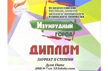 19 мая 2024 года в г.Зеленодольск (Республика Татарстан) под эгидой Международного фестивального центра «Феникс» состоялся VII Всероссийский фестиваль-конкурс детского, юношеского и взрослого творчества «Изумрудный город», в котором приняли участие учащиеся отделения эстрадного (вокального) искусства нашей школы (преподаватель – Агмалов Д.А.).