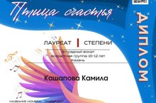 - в номинации «Эстрадный вокал. Возрастная группа: 10 – 12 лет», Кашапова Камила – Лауреат I степени;