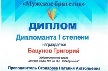 - в номинации «Художественное слово», Бацунов Григорий (преподаватель – Столярова Н.А.) – Дипломант I степени.