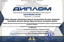 5 мая 2025 года в г.Санкт-Петербург под эгидой Международного арт-центра «Империал» и при поддержке Союза композиторов России, Творческого объединения «Премьера», Международного центра заочных фестивалей и конкурсов «Меркурий» и Сообщества организаторов фестивалей и конкурсов России и СНГ, в онлайн-формате состоялся Всероссийский многожанровый фестиваль-конкурс искусств «Вдохновение России», в котором приняли участие учащиеся отделений вокально-хорового и эстрадного (инструментального) искусства нашей школы (преподаватели – Данилова М.Н., Закиров А.А., Хабибулин Р.Н.).