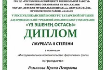 - в номинации «Инструментальное исполнительство: фортепиано (соло), Романова И.П. – Лауреат II степени;