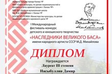 - в номинации «Общее фортепиано. 10 – 12 лет. Соло», Насыбуллин Дамир (преподаватель – Романова И.П.) – Лауреат III степени.