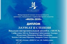 12 апреля 2020 года в Казани состоялся заочный Международный конкурс инструментального, вокального, театрального и хореографического искусства «MUZA – 2020», в котором приняли участие учащиеся и преподаватели нашей школы.По результатам конкурса:- в номинации «Общее фортепиано. Средняя группа», Салахова Алиса (преподаватель – Закирова А.А.) – Лауреат II степени;- вокально-инструментальный ансамбль «АНЭСА» (преподаватели: Гайнетдинова Э.И., Закирова А.А., Зыкова С.Ю., Низамиева Н.Н., Сайфуллина А.Ф.) – Лауреат II степени.ПОЗДРАВЛЯЕМ НАШИХ ЛАУРЕАТОВ И ЖЕЛАЕМ ИМ ДАЛЬНЕЙШИХ ТВОРЧЕСКИХ УСПЕХОВ!!!
