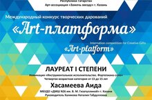 Аида Хасамеева ( класс преподавателя Халиковой Н.Г.) стала Лауреатом 1 степени Международного конкурса "Art -платформа" Арт-Ассоциации "Зажечь звезду" ГБУДО РЦВР г. Казани. Желаем дальнейших успехов!