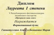 Дважды Лауреат 1 степени - Гилязова Алина, так же Алина в дуэте со своим преподавателем Валиевой Ригиной Рифинатовной стали Лауреатами 1 степени!