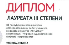 III Республиканский конкурс исследовательских работ учащихся в области искусства "ART дебют" состоялся в Институте филологии и межкультурной коммуникации им.Льва Толстого 24 марта 2017 года. Поздравляем Дубову Ульяну (преподаватель Наталья Михайловна Чалдаева), получившую звание Лауреата III степени, в номинации "Мировая художественная культура"!