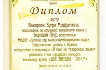 Поздравляем воспитателя по обучению татарского языка Бакирову З.М. и воспитанника старшей логопедической группы Бородина Петра с вручением диплома районного этапа конкурса "Две звезды - учитель и ученик 2017" - победители в номинации "Я пою на татарском языке".