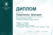 Поздравляем ученицу 8А класса Генунтегину Викторию с победой на IV Городском конкурсе "Сила звучащего слова". Вика получила диплом лауреата 3 степени в номинации "Соло". Молодец!!!