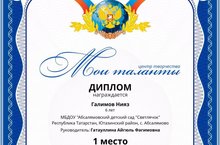 Во всероссийском творческом конкурсе "Мои талантты", посвященный Дню космонавтики воспитанник нашего детского сада Галимов Нияз за работу "Космические фантазии" награжден грамотой 1 степени. Педагог: Гатауллина Айгуль Фагимовна