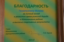 Ученик 8 класса МБОУ "Абсалямовская ООШ" Гиззатуллин Ислам за достижения в греко-римской борьбе был награжден благодарностью главы Ютазинского муниципального района Р.М. Нуриева.