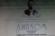 Диплом за 1 место Всероссийского творческого конкурса, посвященного 160-летию со дня рождения А.П. Чехова, награждается Сафиуллина Гульнара Гарафутдиновна, учитель русского языка и литературы, в номинации "Фотография и видео". Поздравляем и желаем творческих успехов!