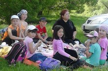 Сегодня ученики начальных классов ходили в поход к речке Дымка. Дети играли в подвижные игры, наблюдали за лягушками, изучали деревья, которые обгрызли бобры. пытались найти хатку бобров.